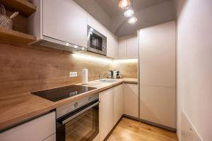 Das Apartment verfügt über ein separates Schlafzimmer sowie einen Wohnraum mit Flachbild-TV und insgesamt drei Betten. Die voll ausgestattete Küche beinhaltet moderne Geräte einschließlich eines Wäschetrockners und ermöglicht eine komfortable Zubereitung von Mahlzeiten während des Aufenthalts.