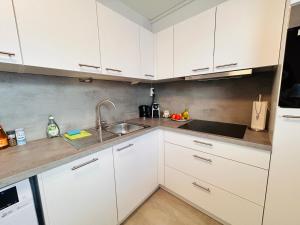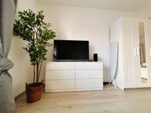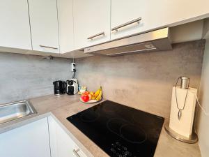 Das Einzimmerapartment verfügt über ein Wohnzimmer mit einem Flachbildfernseher inklusive Kabelkanälen sowie einer Sitzecke und einem Schlafsofa für zusätzlichen Schlafplatz oder zur Entspannung. Die voll ausgestattete Küche beinhaltet moderne Geräte wie Kühlschrank, Geschirrspüler, Mikrowelle, Toaster sowie Kaffeemaschine und Tee-/Kaffeezubereitungsmöglichkeiten, ein Esstisch ist ebenfalls vorhanden.