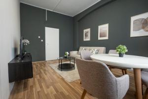 Die Unterkunft umfasst ein Wohnzimmer, ein Schlafzimmer mit zwei Betten sowie ein Badezimmer mit Badewanne oder Dusche und kostenfreien Pflegeprodukten wie Shampoo und Duschgel. Zur Ausstattung gehören Bügeleisen und Bügelbrett, Heizungssystem, Waschmaschine, Wäscheständer sowie bereitgestellte Handtücher und Bettwäsche. Für Komfort sorgen Sitzgelegenheiten mit Sofa sowie Kleiderschrank.