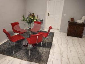 Das geräumige Apartment umfasst zwei separate Schlafzimmer sowie ein Wohnzimmer mit Schlafsofa und Arbeitstisch. Die voll ausgestattete Küche verfügt über moderne Geräte wie Backofen, Kochfeld, Geschirrspüler, Kühlschrank, Kaffeemaschine und Tee-Zubereitungsmöglichkeiten sowie sämtliches benötigtes Küchenzubehör für komfortables Essen. Das Badezimmer ist mit Badewanne und Dusche ausgestattet, zudem gibt es einen Whirlpool im Zimmer zur Entspannung. Weitere Annehmlichkeiten umfassen Handtücher, Bettwäsche, Shampoo, Conditioner, Duschgel und Haartrockner.
