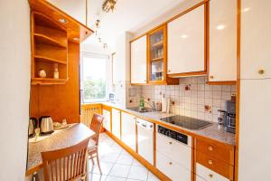 Die Wohnung verfügt über zwei Schlafzimmer mit individuell regulierbarer Klimaanlage sowie synthetischen Kopfkissen ohne Federn für zusätzlichen Komfort. Gästen steht eine voll ausgestattete Küche zur Verfügung, die über Backofen, Herdplatte, Kühlschrank, Geschirrspüler, Mikrowelle sowie eine Kaffeemaschine inklusive Tee- und Kaffeezubehör und einen Wasserkocher verfügt, alle notwendigen Küchenutensilien sind vorhanden. Ein Esstisch ergänzt die Ausstattung. Das Badezimmer bietet sowohl eine Badewanne mit Whirlpool-Funktion als auch Duschmöglichkeiten, kostenfreie Pflegeprodukte wie Shampoo, Conditioner, Duschgel sowie ein Bademantel sind ebenfalls vorhanden.