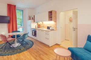 Die Unterkunft verfügt über ein Schlafzimmer mit Parkettboden, Heizung und einem Sitzbereich inklusive Schlafsofa. Die komplett ausgestattete Küche beinhaltet unter anderem einen Backofen, Herdplatte, Kühlschrank, Geschirrspüler, Kaffeemaschine sowie Toaster sowie Tee- und Kaffeezubereitungsmöglichkeiten inklusive Küchenutensilien für den Gästekomfort. Das Badezimmer ist ausgestattet mit kostenfreien Pflegeprodukten wie Shampoo und Duschgel sowie einer Dusche und einem Haartrockner.