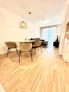 Jedes Apartment besteht aus einem Wohnzimmer, einem separaten Schlafzimmer sowie einem privaten Badezimmer mit Badewanne und kostenlosen Pflegeprodukten wie Shampoo und Duschgel. Die voll ausgestattete Küche verfügt über moderne Geräte wie Kochfeld, Kühlschrank, Geschirrspüler, Backofen, Toaster, Kaffeemaschine und Wasserkocher sowie vollständiges Küchenzubehör zur Selbstverpflegung. Zusätzliche Annehmlichkeiten sind schallisolierte Wände für Ruhe, Heizung, Parkett- oder Fliesenboden, Kleiderschrank oder Schrankraum, Sofa mit Schlafsofaoption, Bügeleisen, Wäscheständer, allergikerfreundliche Kissen ohne Federn, Waschmaschine sowie Bettwäsche und Handtücher.