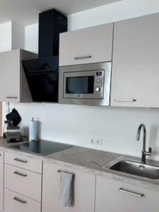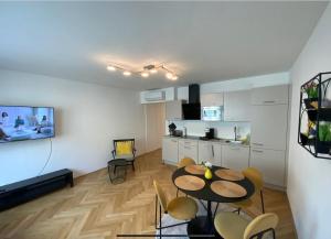 Das schallisolierte Apartment verfügt über ein klimatisiertes Schlafzimmer mit zwei Betten und Kleiderschrank sowie einen Sitzbereich mit Flachbildfernseher und Schlafsofa. Die voll ausgestattete Küche beinhaltet eine Kochplatte, Kühlschrank, Mikrowelle, Toaster, Kaffeemaschine, Wasserkocher sowie einen Esstisch zur bequemen Zubereitung der Mahlzeiten.