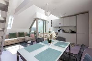 Das Badezimmer ist modern ausgestattet mit einer bodengleichen Dusche ohne Stufen sowie zwei Toiletten - darunter ein zusätzliches WC für mehr Komfort - Shampoo-, Duschgel- und Haartrocknerausstattung sind ebenfalls vorhanden. Weitere Annehmlichkeiten umfassen einen Flachbildfernseher mit Kabelkanälen während des gesamten Aufenthalts, das WLAN steht im gesamten Apartment kostenfrei zur Verfügung. Gäste können den Blick vom Balkon genießen oder auf der Sonnenterrasse entspannen, ein Aufzug ermöglicht den Zugang zu den oberen Etagen.