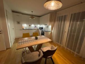 Das Apartment umfasst zwei Schlafzimmer mit insgesamt drei Betten, ausgestattet mit Parkettboden und durchgehend beheizt. Die voll ausgestattete Küche beinhaltet Herdplatte, Backofen, Geschirrspüler, Kühlschrank, Mikrowelle sowie Kaffee- und Teezubereitungsmöglichkeiten inklusive Geschirr und Esstisch. Weitere Ausstattungsmerkmale sind Handtücher, Bettwäsche, Bügeleisen, Kleiderschrank oder Schrankfläche, Schreibtisch sowie Waschmaschine.