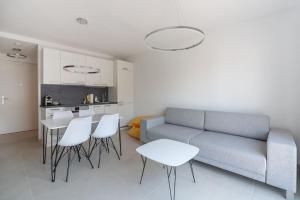 Die Wohnung verfügt über ein Schlafzimmer mit zwei Betten sowie ein separates Wohnzimmer mit Schlafsofa und Sitzbereich. Die voll ausgestattete Küche beinhaltet moderne Geräte wie Backofen, Herdplatte, Kühlschrank, Geschirrspüler, Kaffeemaschine und Wasserkocher sowie Tee- und Kaffeezubehör, ergänzt durch einen Essbereich.