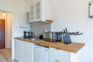Das moderne Studio verfügt über eine voll ausgestattete Küche mit Kochfeld, Kühlschrank, Mikrowelle, Wasserkocher sowie Küchenutensilien inklusive Tee- und Kaffeezubereitungsmöglichkeiten. Ein Esstisch steht den Gästen ebenfalls zur Verfügung. Das private Badezimmer ist mit Badewanne ausgestattet, Shampoo und Duschgel werden bereitgestellt ebenso wie Handtücher und ein Haartrockner. Für Komfort sorgt eine Heizung während des gesamten Aufenthalts.