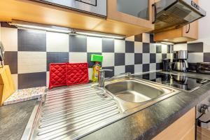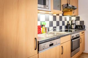 Das Apartment verfügt über zwei Schlafplätze verteilt auf ein separates Schlafzimmer sowie das Wohnzimmer mit einem Schlafsofa. Das private Badezimmer ist mit Dusche ausgestattet, ein Haartrockner wird bereitgestellt. Die Küchenzeile beinhaltet moderne Geräte wie Backofen, Herdplatte, Geschirrspüler, Kühlschrank, Kaffeemaschine, Mikrowelle und Toaster sowie sämtliches notwendige Kochgeschirr.