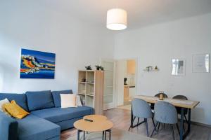 Die Unterkunft umfasst ein Schlafzimmer sowie ein Wohnzimmer mit Parkettboden, Schlafsofa, Sitzbereich und Flachbildfernseher. Die Küche ist komplett ausgestattet mit modernen Geräten wie Backofen, Herdplatte, Geschirrspüler, Kühlschrank sowie Tee- und Kaffeezubereitungsmöglichkeiten für den Komfort der Gäste.