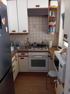 Die Wohnung bietet Platz für bis zu drei Gäste mit zwei separaten Schlafzimmern und einem Wohnzimmer mit insgesamt drei Betten. Die Küche ist modern ausgestattet mit Backofen, Herdplatte, Mikrowelle, Kühlschrank, Geschirrspüler, Toaster, Kaffeemaschine sowie Wasserkocher inklusive Tee- und Kaffeezubehör sowie vollständigem Kücheninventar und einem Esstisch für komfortables Kochen und Essen.