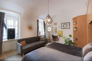 Die Unterkunft bietet ein Schlafzimmer mit Parkettboden aus Holz und Heizung für angenehmen Komfort. Die voll ausgestattete Küche umfasst Kochutensilien, Kochfeld, Kühlschrank, Wasserkocher, Kaffeemaschine sowie einen Esstisch für alle Kochbedürfnisse. Der Wohnbereich ist mit einem Sofa ausgestattet.