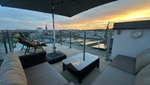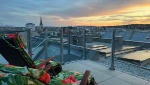 Weitere Annehmlichkeiten umfassen kostenfreies WLAN im gesamten Apartment sowie Steckdosen an den Nachttischen zum Laden von Geräten. Ein separater Eingang garantiert Exklusivität, barrierefreie Parkplätze stehen ebenso zur Verfügung wie eine Parkgarage vor Ort. Auf dem Balkon laden Outdoor-Möbel zum Entspannen mit Blick auf die Stadt ein.