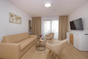 Die Unterkunft bietet einen privaten Check-in- und Check-out-Service sowie einen Aufzug zu den oberen Etagen mit separatem Zugang zu den Apartments. Sicherheitseinrichtungen umfassen Rauchmelder und Feuerlöscher in den Wohnungen. Im Außenbereich laden Gärten mit Terrassen- oder Balkonmöbeln zum Entspannen ein. Zudem können Gäste nahegelegene Wanderwege nutzen sowie Tennis spielen oder Fahrrad fahren.