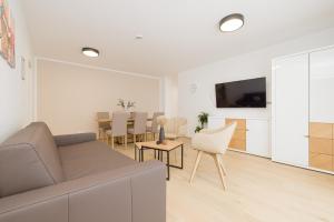 Jedes geräumige Apartment verfügt über ein Wohnzimmer, drei separate Schlafzimmer sowie zwei Badezimmer mit Badewanne oder Dusche. Die voll ausgestatteten Küchen sind mit Kochfeld, Kühlschrank, Geschirrspüler, Mikrowelle, Backofen, Kaffeemaschine, Toaster und elektrischem Wasserkocher sowie Essbereichen ausgestattet. Zur weiteren Ausstattung gehören Flachbild-Kabel-TV, Bügelmöglichkeiten mit Bügeleisen und -brett, Kleiderschränke zur Aufbewahrung sowie Sofas mit Schlafsofas für zusätzliche Schlafplätze. Für Komfort sorgen Heizung und schallisolierte Wände für erhöhte Privatsphäre.